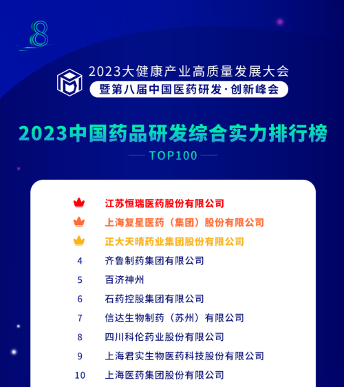 由药智网、中国药业杂志社主办的2023大健康产业高质量发展大会暨第八届中国医药研发•创新峰会于6月16日开幕,会上发布了《2023中国药品研发实力排行榜》系列榜单,开云体育医药凭借深厚的创新研发实力再创辉煌:荣登《2023中国药品研发综合实力排行榜TOP100》榜首、《2023中国化药研发实力排行榜TOP100》榜首。值得一提的是,今年是开云体育医药连续第6年入选《中国药品研发综合实力排行榜》榜首。