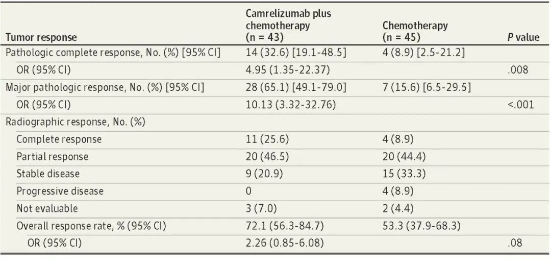 北京时间8月3日,开云体育医药创新药卡瑞利珠单抗联合化疗(Cam+CT)对比化疗(CT)新辅助治疗ⅢA/ⅢB (T3N2) 期非小细胞肺癌(NSCLC)结果在线发表于国际权威期刊JAMA Oncology[1]。该研究是由空军军医大学唐都医院姜涛教授、雷杰教授团队联合陕西省肿瘤医院雷光焰教授团队、兰州大学第二附属医院王成教授团队共同参与的一项随机对照、多中心、Ⅱ期临床研究(TD-FOREKNOW,NCT04338620)。研究结果显示,与化疗相比,卡瑞利珠单抗联合化疗新辅助治疗NSCLC显著提高了病理完全缓解(pCR)率(32.6% vs 8.9%,OR=4.95,95% CI :1.35-22.37, P =0 .008),且安全性良好。本研究是卡瑞利珠单抗新辅助治疗可切除NSCLC患者的首个随机对照研究,为NSCLC新辅助免疫治疗再添新证。