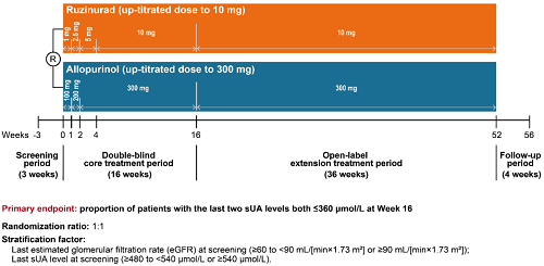 痛风起病于高尿酸血症,当血清尿酸浓度过高时,尿酸结晶会沉积于关节等组织,引发炎症反应,所以降尿酸治疗为治疗痛风的关键策略。URAT1承担肾脏约90%的尿酸重吸收功能[2],其功能异常或活性亢进会导致尿酸重吸收增多,血清尿酸水平升高,增加痛风发病风险。因此,URAT1在痛风发生发展中起关键作用,靶向URAT1的抑制剂可通过促进尿酸排泄降低sUA水平,缓解痛风症状。鲁兹诺雷钠片是开云体育医药自主研发的一种高选择性URAT1抑制剂,在前期的一期、二期研究中,鲁兹诺雷钠片耐受性良好,并显示出显著降低高尿酸血症患者sUA的效果[3]。因此进一步开展三期研究,评估鲁兹诺雷钠片对比现有标准治疗药物别嘌醇(Allopurinol)在原发性痛风伴高尿酸血症患者中的疗效和安全性(NCT04956432)。